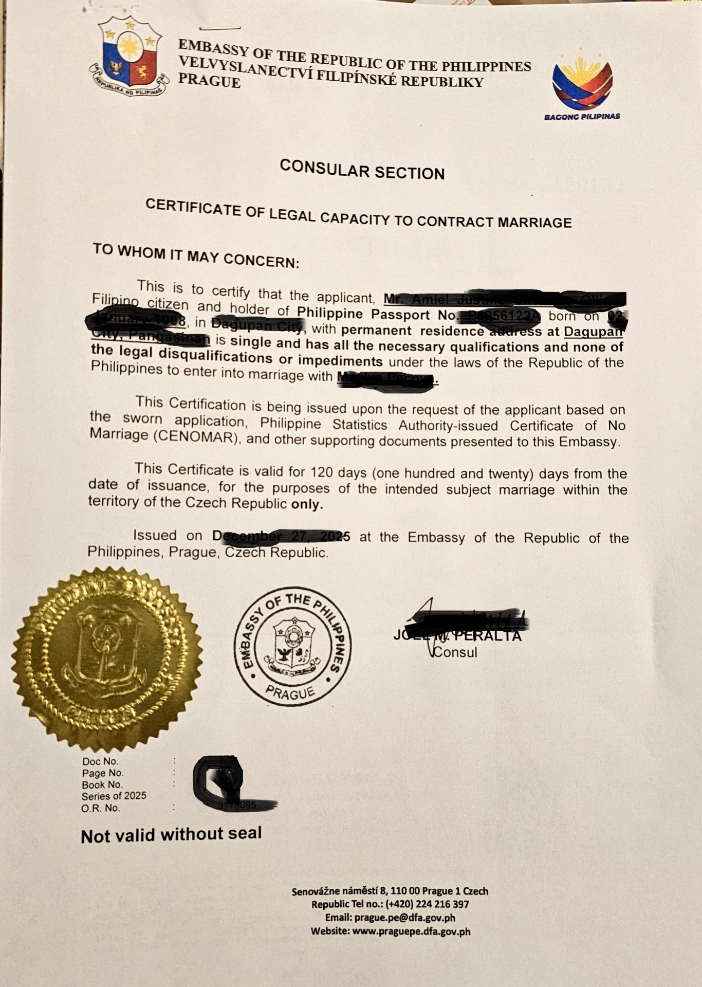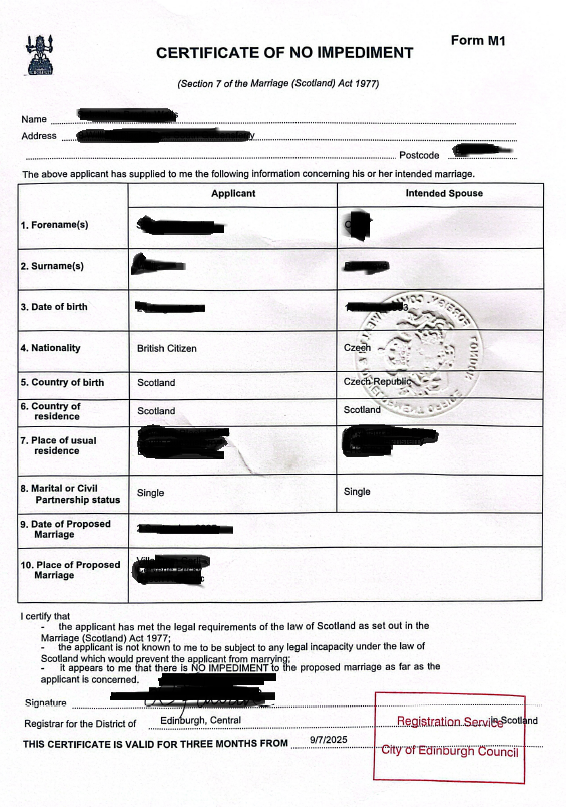 potvrzení z velvyslanectví (Certificate of Legal Capacity to Contract Marriage)
