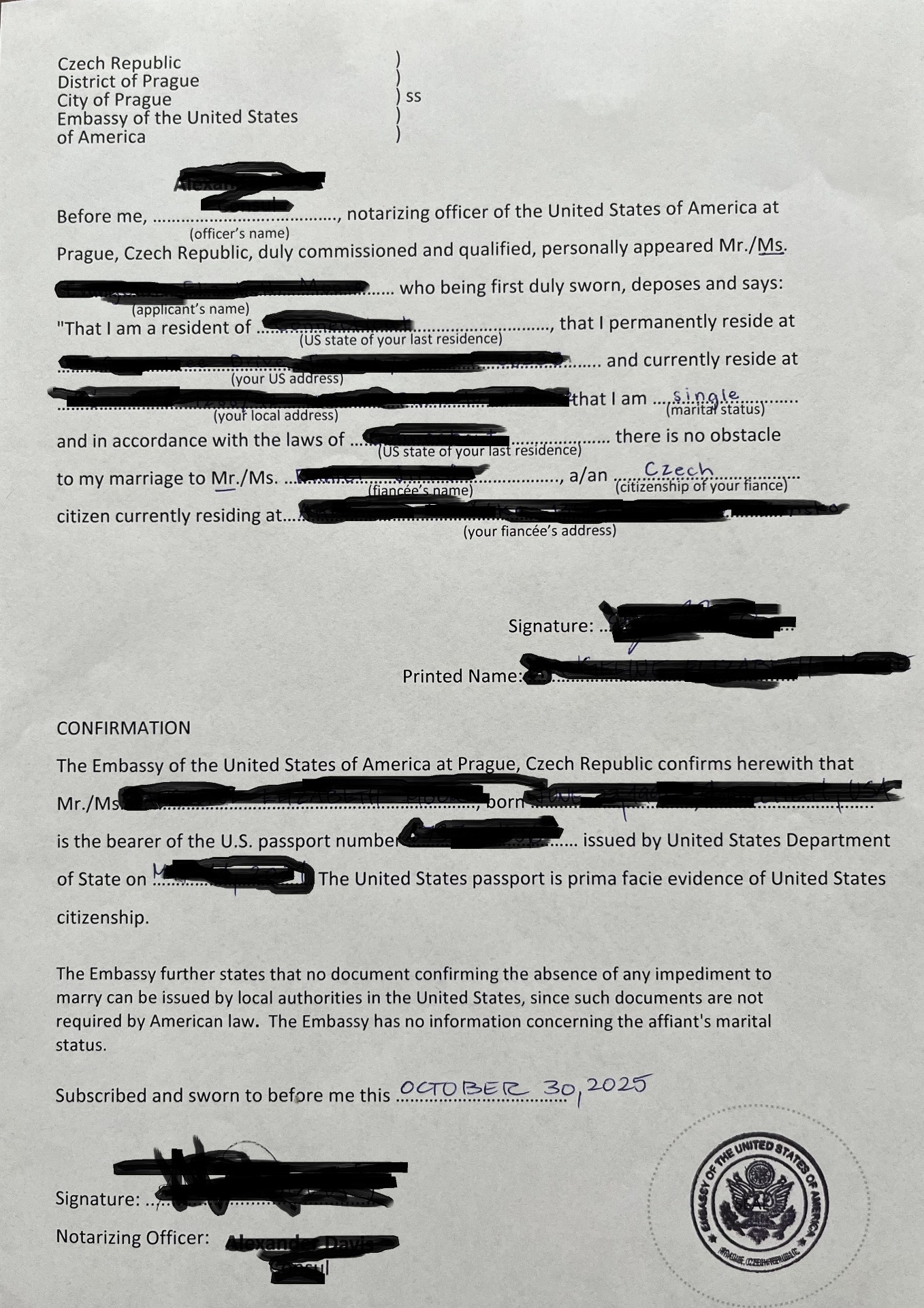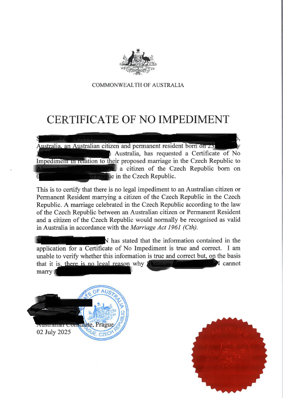 potvrzení z velvyslanectví (Certificate of No Impediment)